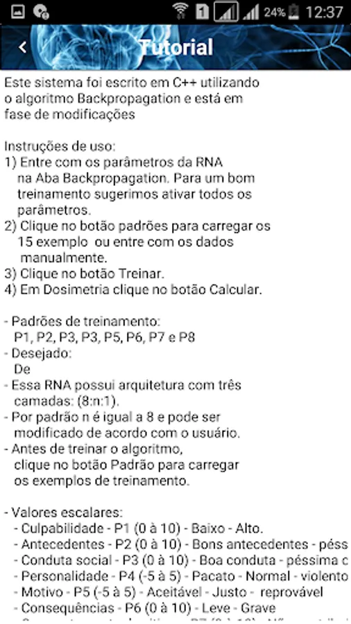 This application uses a neural network (Backpropagation) to calculate the Phase 1 dosimetry in criminal law.