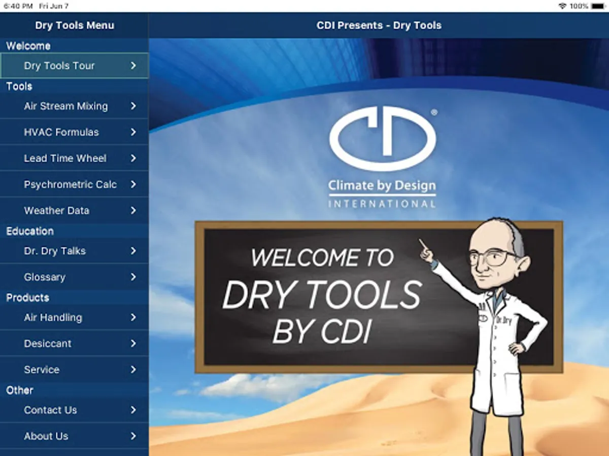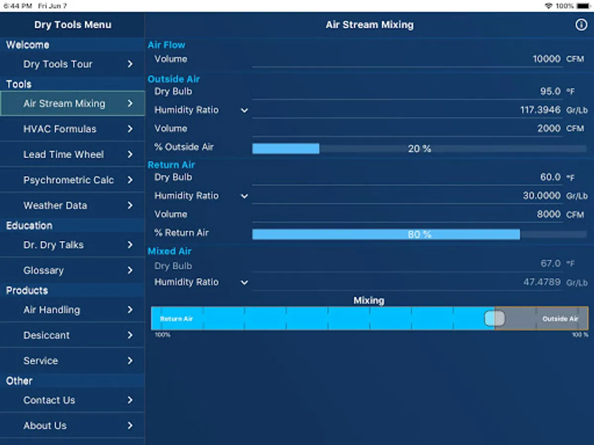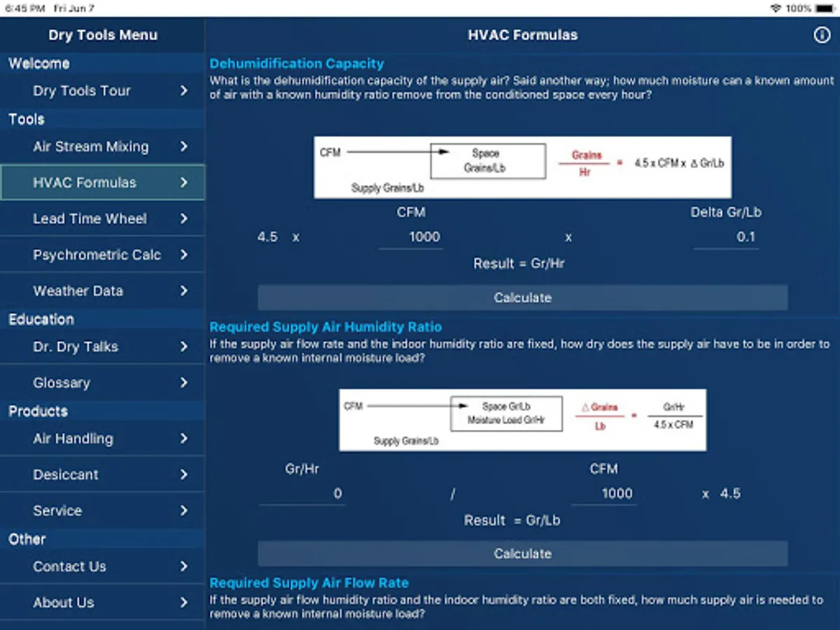 Dry Tools by CDI contains multiple tools to calculate Air Stream Mixing, HVAC formulas, Lead Times, as well as a Psychrometric calculator with integrated weather data for HVAC professionals and students. The app is designed to be your first step to calculating the conditions you need to achieve your critical mission.