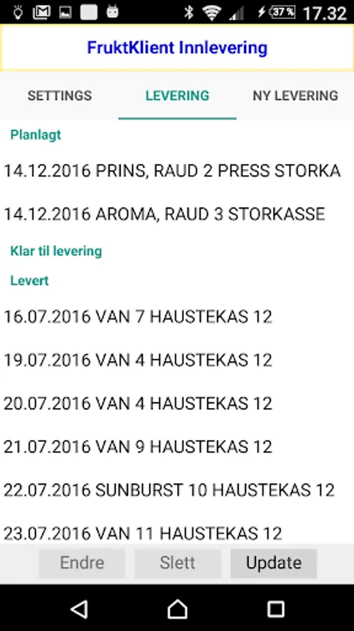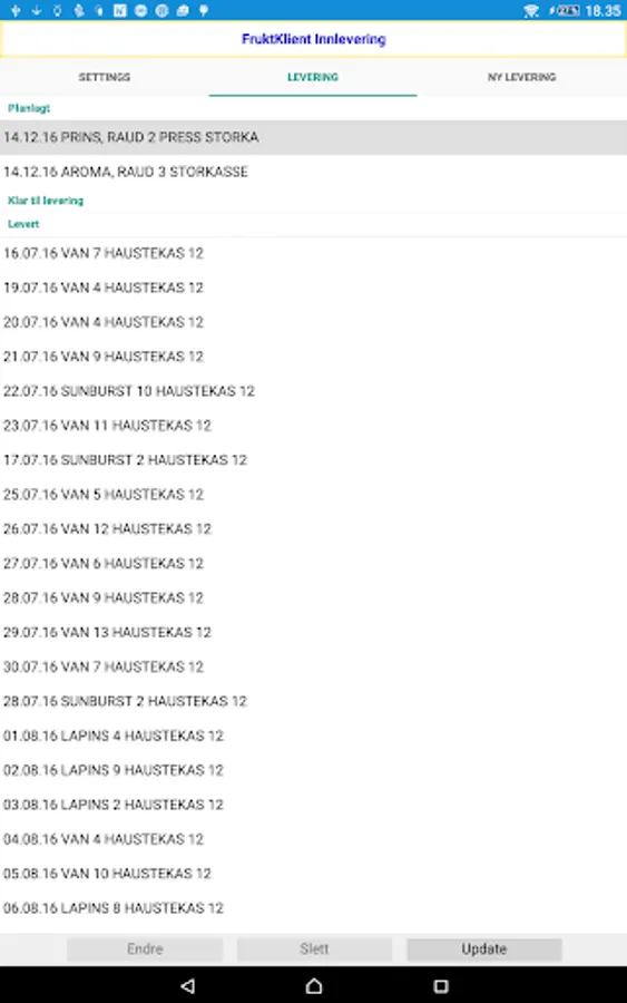 Enter and change registrations of fruit and berries for FruktKlient. Entries can be changed until they have been received at the warehouse / packing plant. You also get an overview of previous entries and sorting results.