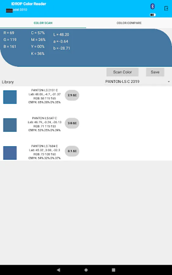 Permite leer colores de casi cualquier superfice, en formato RGB, CNYK y LAB, permitiendo guardar el color, compararlo con otros colores leidos o de la biblioteca, o generar una biblioteca propia.