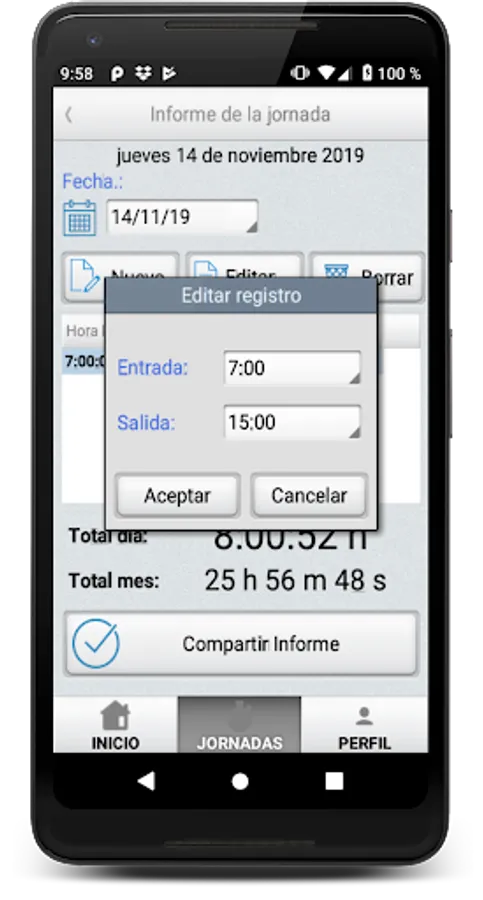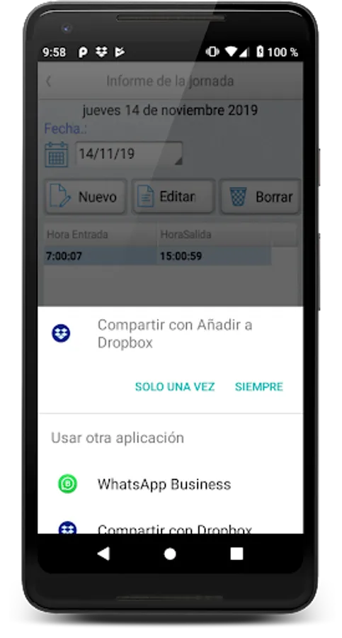 This app allows you to create a report in Excel format (xls) and allows you to share it for any services such as Whatapp, Email, ect.