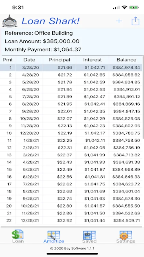 Want to know what your principal balance will be after a certain number of payments? Loan Shark! provides such information instantly with the amortization screen. Need to estimate payments for your clients and text the information to them? Loan Shark! lets you produce loan terms, payments and amortization schedules that can be emailed or sent via text.