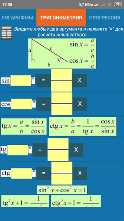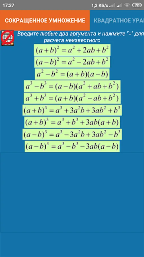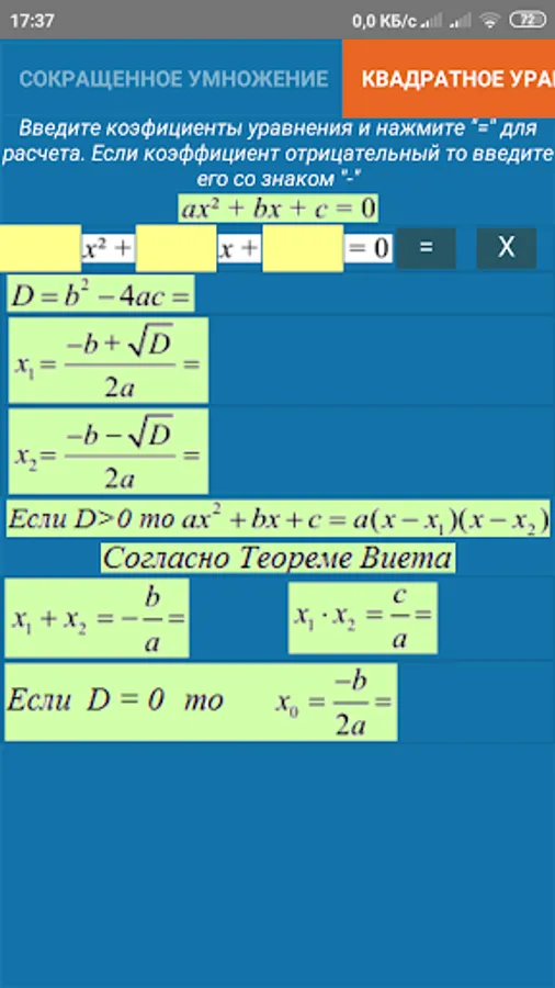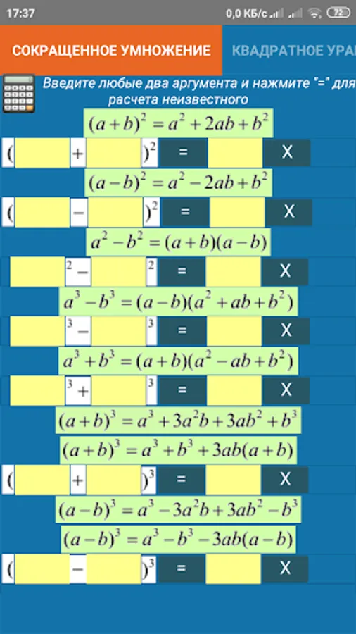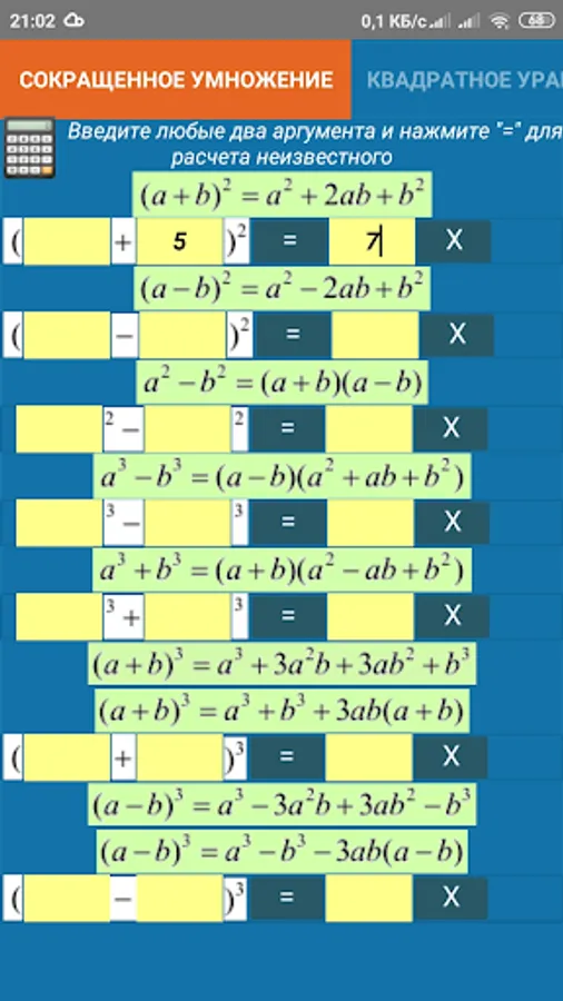 Now you don’t have to rummage through the textbook, the program contains the main algebra formulas needed by schoolchildren. The calculator next to the formulas finds an unknown value if all the others are known, which helps in solving problems.