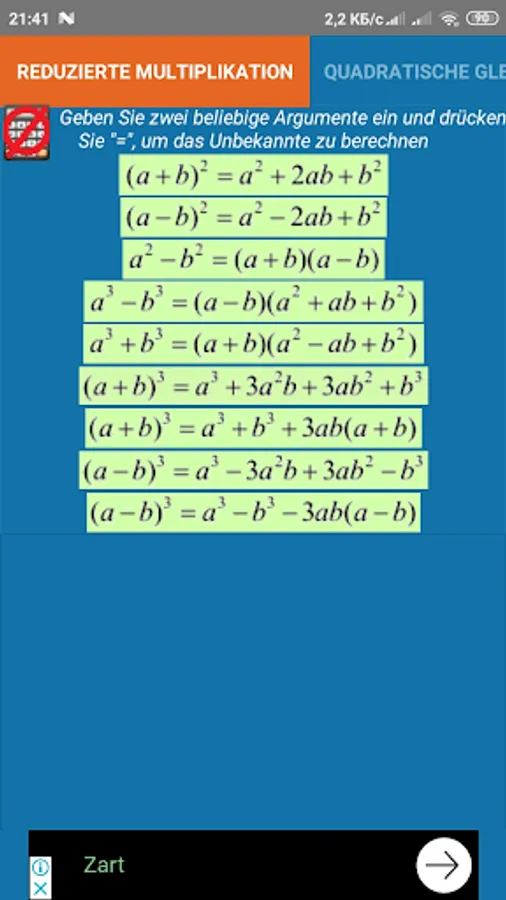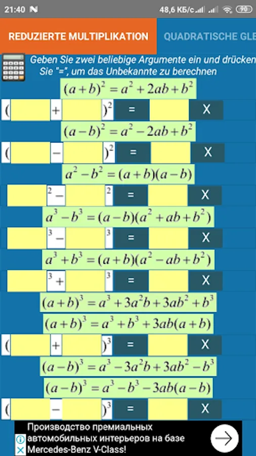 You no longer have to rummage through the textbook, the program contains the most important algebra formulas that schoolchildren need. The calculator next to the formulas finds an unknown value when everyone else is known. This helps in solving problems.