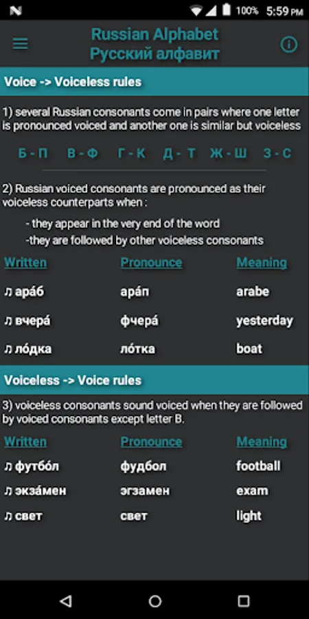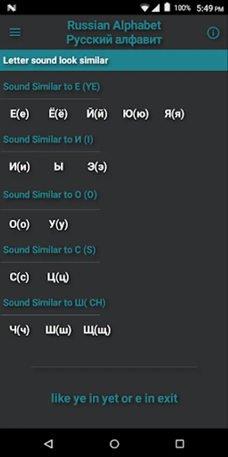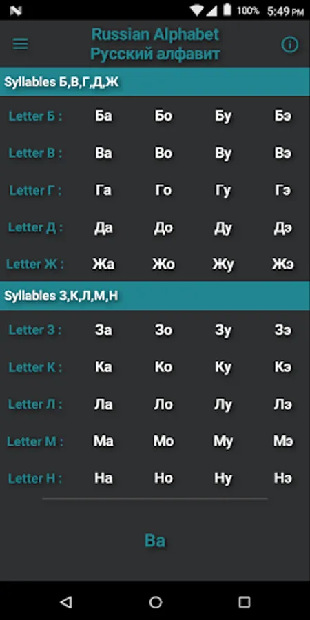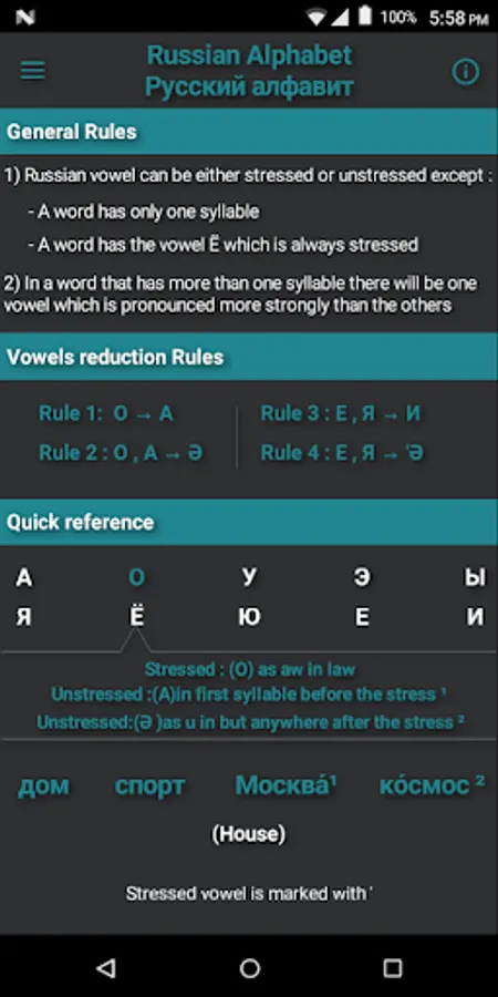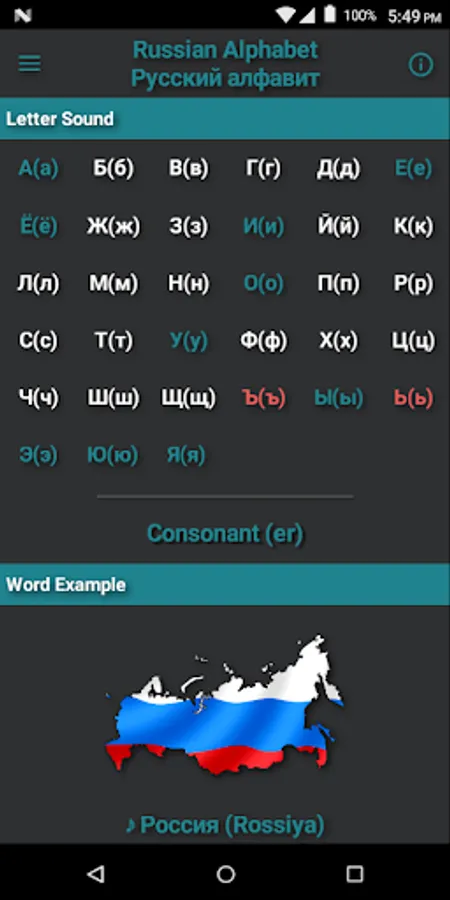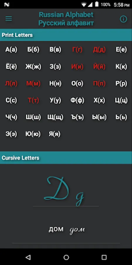 Russian alphabet is an application that let you learn Russian alphabet in an easy way . it contain many features like alphabet ,listening,syllable,cursive letters end to pronounce rules of letters.