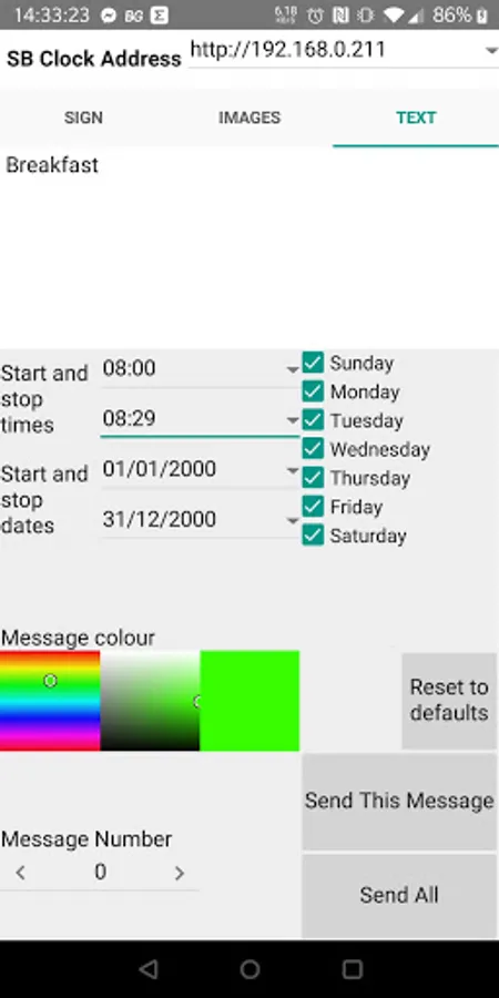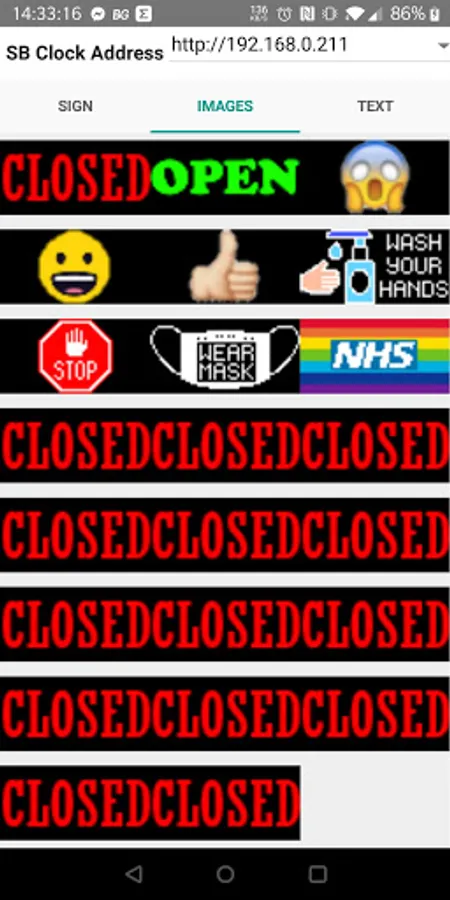 Invisaged uses are as an attractive and accurate clock with day of the week or date function which can be overridden with a scrolling message to be set as a reminder for persons suffering from dementia to remind them to have their meals, take medication, go to bed etc. The signs are also capable of receiving instant messages from this app or other sources.