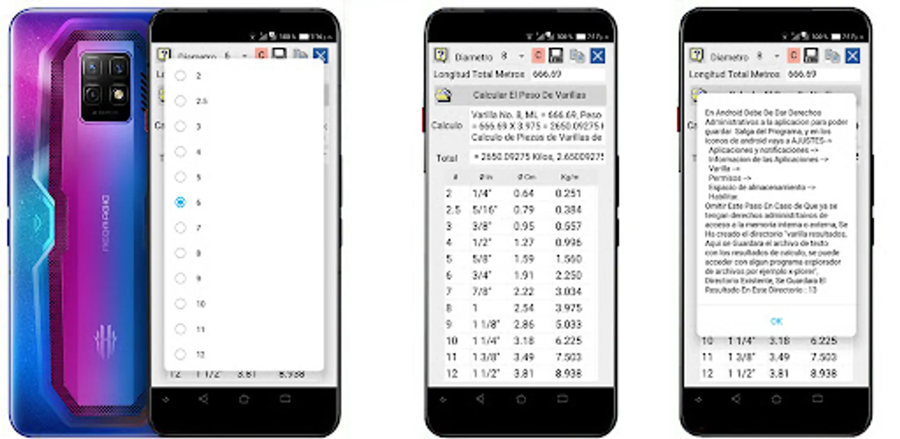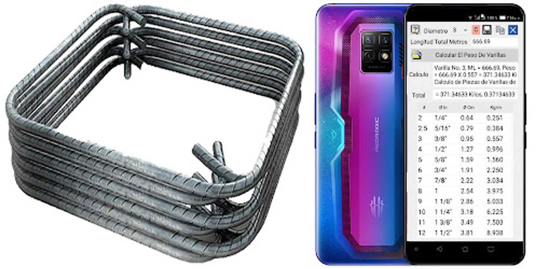 program that calculates the weight of the length of corrugated steel rods having the length as the only data, the software has a table of weights of different diameters and performs the calculations, it gives the option of saving calculations made to a notepad as a text file, or copy the results to the internal memory of the phone, so we can paste the results, for example, to whatsapp or a third-party application, this software avoids loading weight tables physically, and saves you time when buying rods.