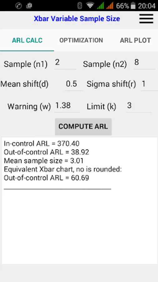 This application can compute the ARL (Average Run Length) of a Xbar control with variable sample size (VSS).