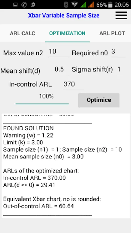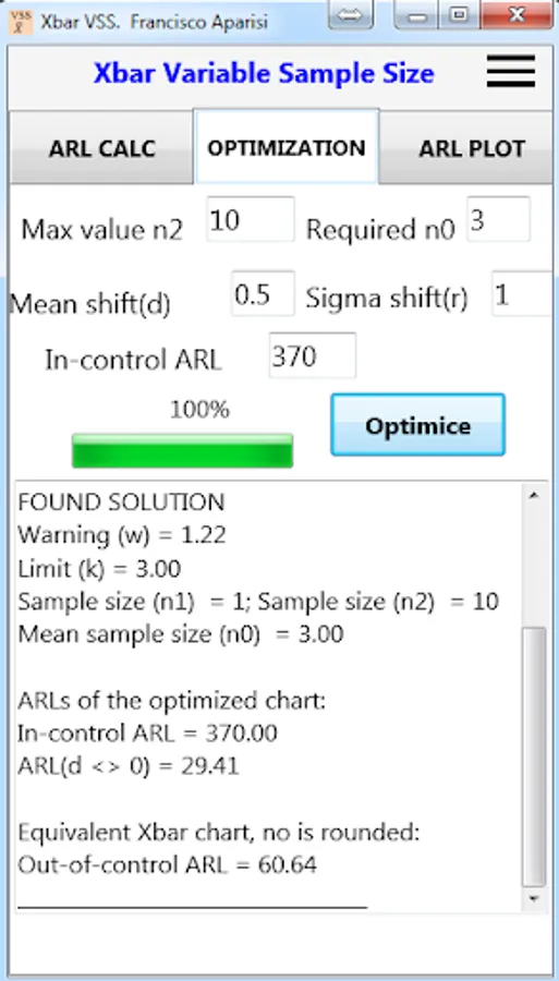 In addition, it performs an optimization of the parameters (warning limit, control limits and the two sample sizes) in order to minimize the out-of-control ARL.