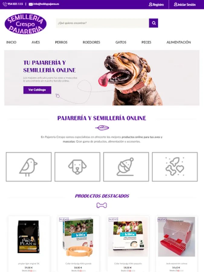 Pajarería Crespo is an online store specializing in the sale of food specializing in birds, dogs, cats, rodents and fish, as well as including a wide range of accessories for your pet.