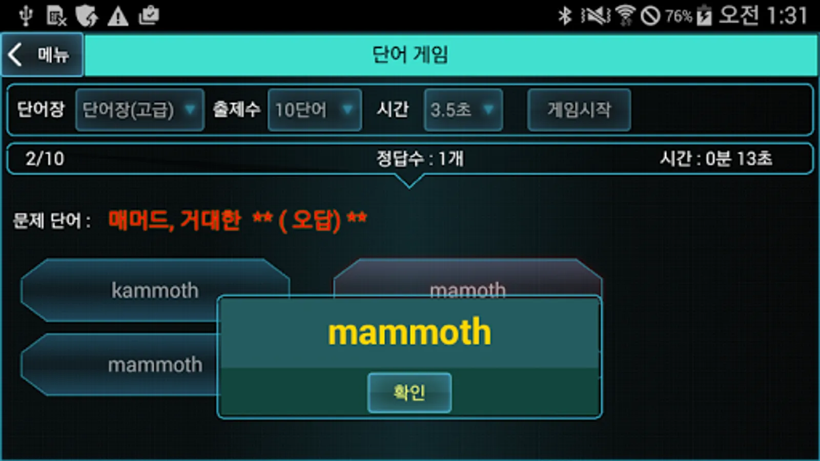 - Ability to adjust word game problem output time to one's original ability in 3.5 seconds (3.5 seconds, 5 seconds, 7 seconds)