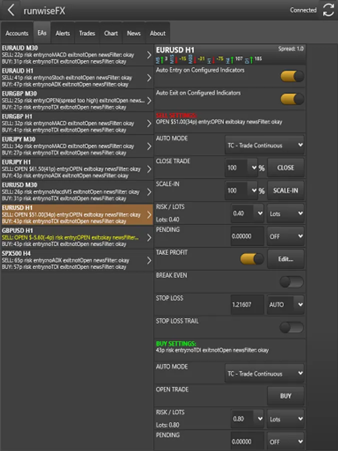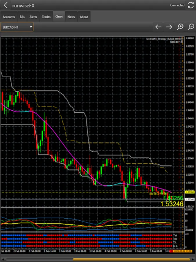 Allows our runwiseFX trade manager panel on your desktop charts to be controlled from your mobile. You can open/close trades, scale-in, adjust SL/TP/pending orders, set for break even and much more. Also view charts as they are on your desktop, complete with custom indicators and other chart information. Alerts, trade history and news events can also viewed. Finally, multiple accounts are supported, including setting equity targets.