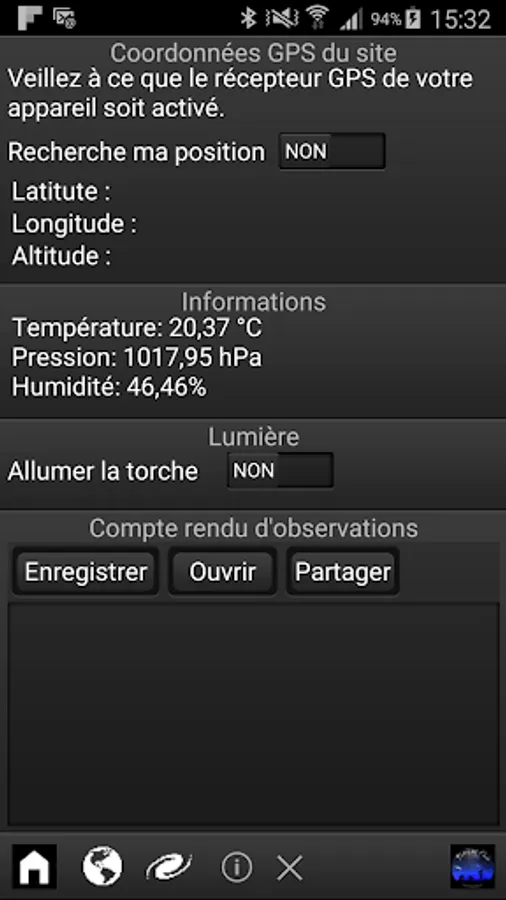 A third page allows, depending on the sensors on your Android device, to obtain: