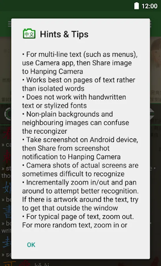 PLEASE READ THIS ALSO: when first using this app, it's tempting to try it out by pointing the camera at Chinese text on a computer screen. However, this is NOT supported because the Moire effect means the image is distorted in a way that cannot be used by the recognition engine. So please point the camera at Chinese text in the real world (e.g. in books) or load images (such as screenshots captured by the device).