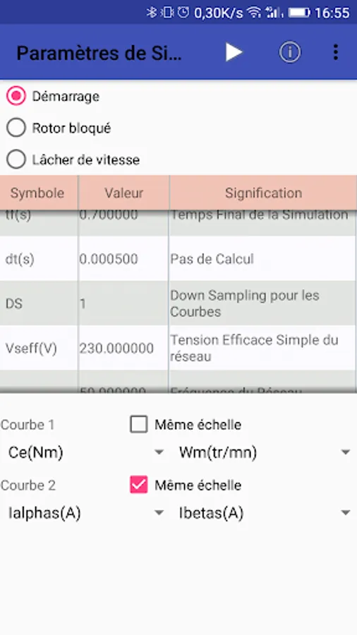 - Parameters of simulation (final time, step time, startup, machine changes, frequency, grid voltage drop, initial speed for non-powered speed drop operating,…)