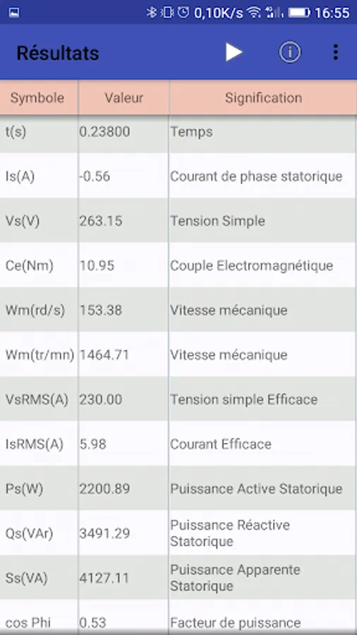 - Curves of phase current and voltage, electromagnetic torque, speed, thetas, V RMS, I RMS, cosPhi, P, Q, S versus time and steady state