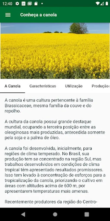 Mais Canola is an application developed by Embrapa Agroenergia that allows managing the entire Canola production cycle. In it, you can register your crop, follow all the stages of planting, generating reports and graphs, and use the seed calculator to have more uniform plantings. The tool provides information on cultivars available on the market, herbicides, insecticides and phytosanitary products suitable for the crop, as well as news, videos, publications and a calendar of courses and events. In the application, it is also possible to clarify all your doubts, talking directly to our researchers, through the Citizen Assistance Service (SAC).
