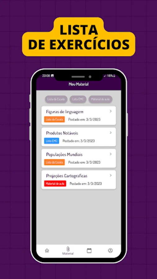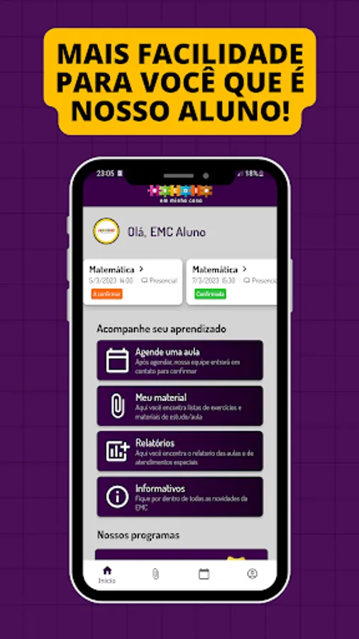 EMC Student has arrived, the Escola Em Minha Casa app for you who are our students. Here you will have access to the list of exercises, class/study materials, performance reports, in addition to being able to schedule classes.