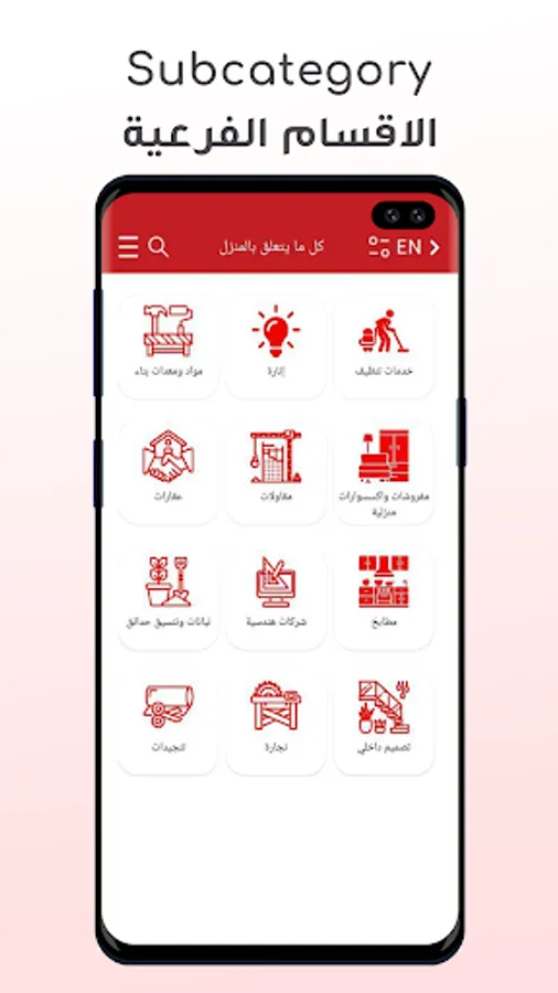ينقسم التطبيق الى عدة فئات بناءً على مجالات وتخصصات المنشآت. على سبيل المثال: كل مايخص المنزل، التعليم، المستشفيات، الترفيه، المطاعم، وغيرها الكثير.