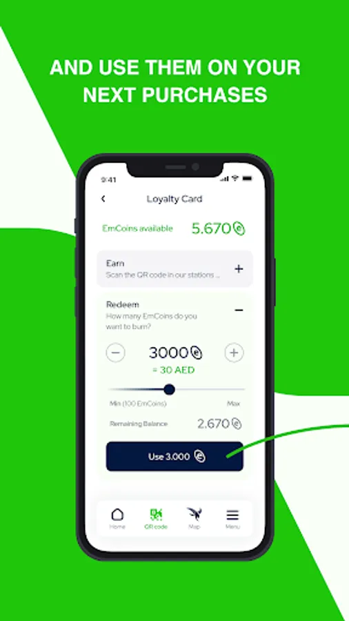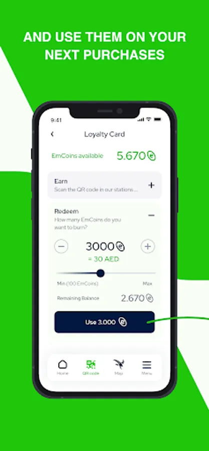 After every purchase, simply scan your personal QR code in the app to receive your points. Whether you're fueling your vehicle, grabbing a coffee at Café Arabicca, or visiting Bakeria, Lube Express or Car Wash, you can collect points at all Emarat services. And to help you kickstart your journey, we'll credit your account with 100 Points just for creating your account.