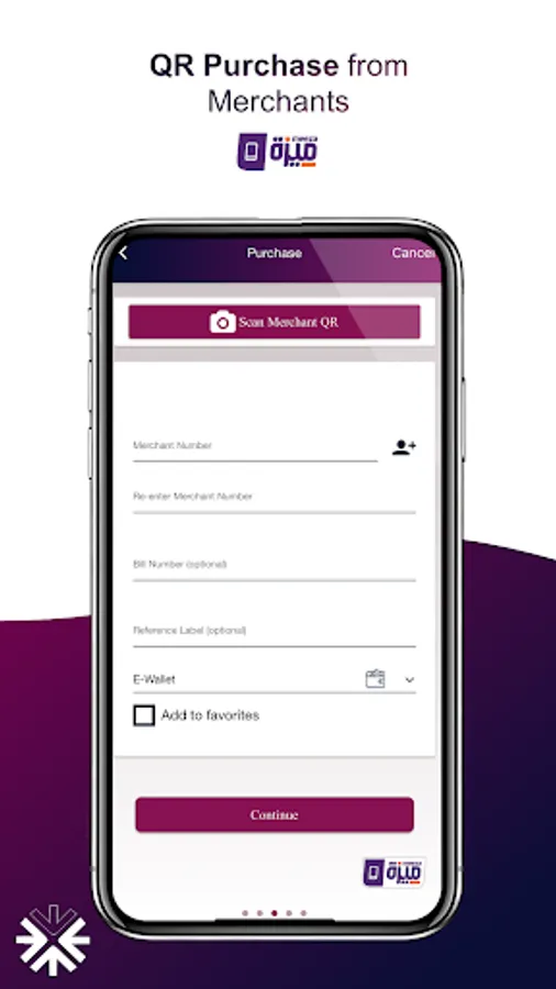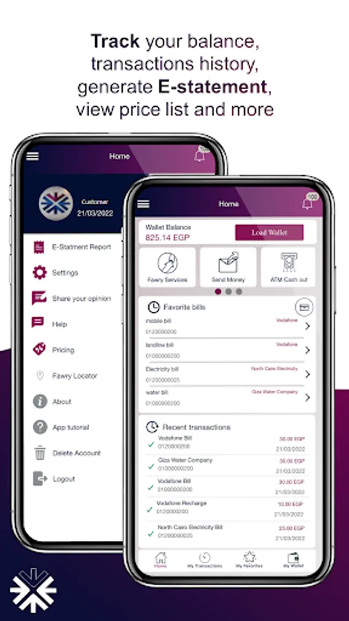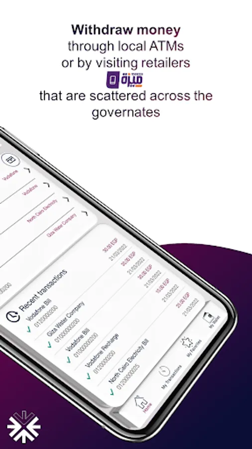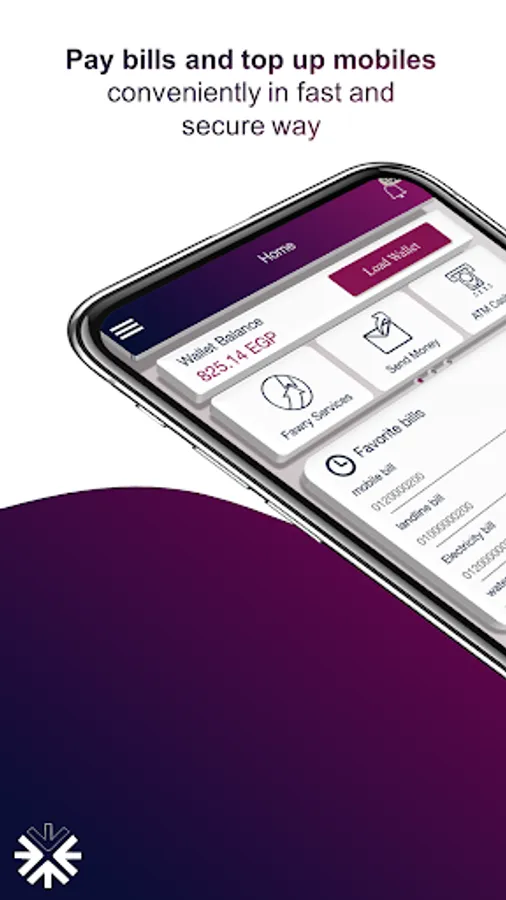 • Create “Favorite list” of your most frequently paid bills to which you can make all payments in just one click or a list of preferred numbers (other Mobile Wallet holders) in addition to a list of favorite merchants and agents