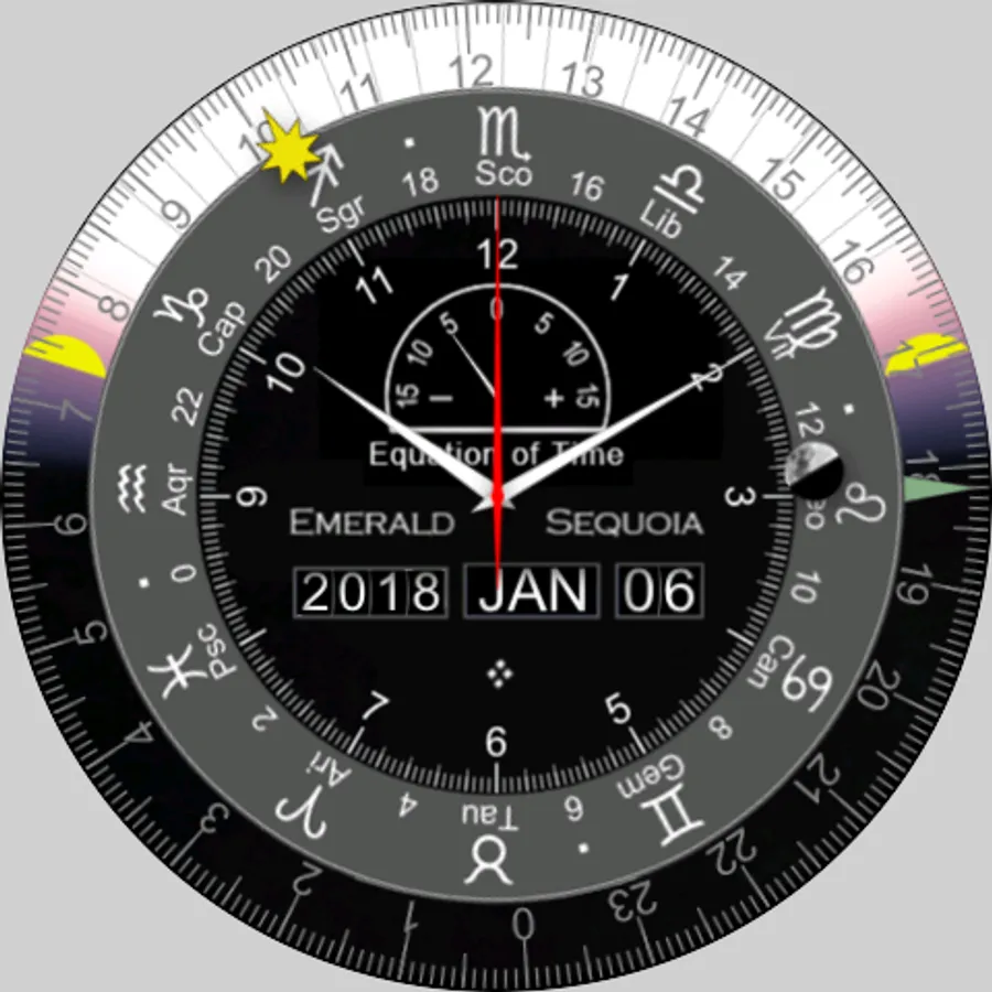 The outer ring is a 24-hour dial which rotates so that the time of local solar noon ("local apparent noon") is at the top. The Sun indicator shows the local 24-hour time. The outer ring's background is divided into day and night sections with twilight in between. These regions move according to the season and the watch's latitude. The straight edges of the yellow semi-circles mark the exact times of sunrise and sunset. When there is no sunrise or sunset (at high latitudes) they disappear behind a cover. Also on the outer dial is a green triangle indicating the current UTC time.