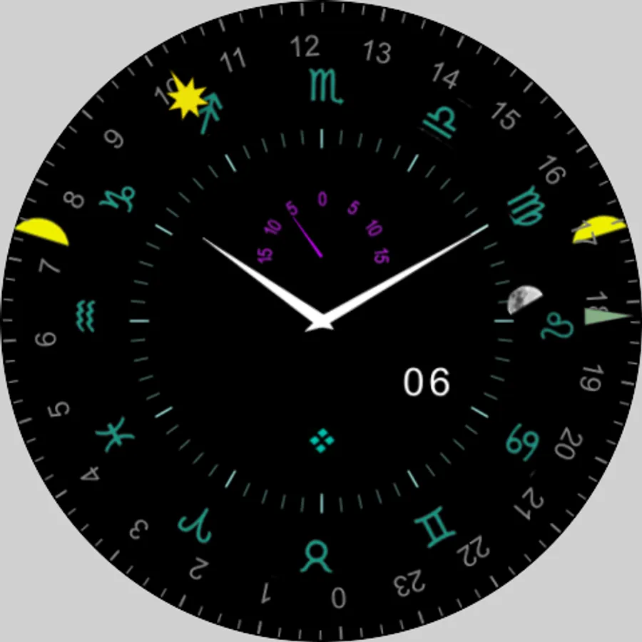 The next ring in is marked with the constellations of the zodiac. It rotates so that the constellation currently transiting the meridian (i.e., due south for northern observers) is at the 12 o'clock position on the face. The Sun indicator also shows the position of the Sun in the sky relative to the zodiac. Another way of saying this is that the zodiac dial rotates once per sidereal day; its numbers represent local apparent sidereal time. The Moon indicator shows the position of the Moon with respect to the zodiac and the Sun (but it is *not* related to the time dials).