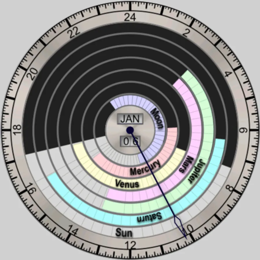 The single hand shows the current 24-hour time (with midnight on top). A planet is currently above the horizon if the hand intersects the colored part of its ring.