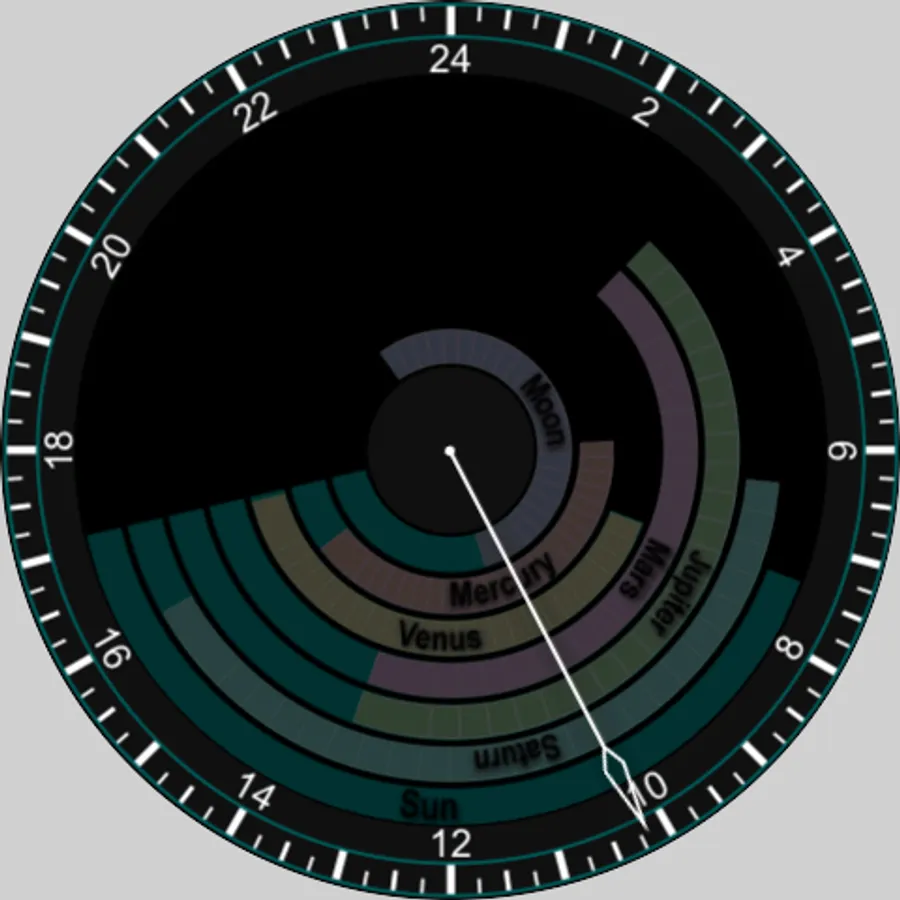The WearOS watch face Emerald Miami, an analog 24-hour face, shows the rise and set times of all of the classical "planets" at the same time. The innermost ring represents the Moon, followed by Mercury, Venus, Mars, Jupiter, Saturn and finally the Sun on the outside. The colored part of each ring represents the time interval when the planet is above the horizon. The light gray region for the Sun (which represents daytime) is reproduced on all the rings.