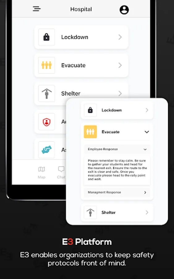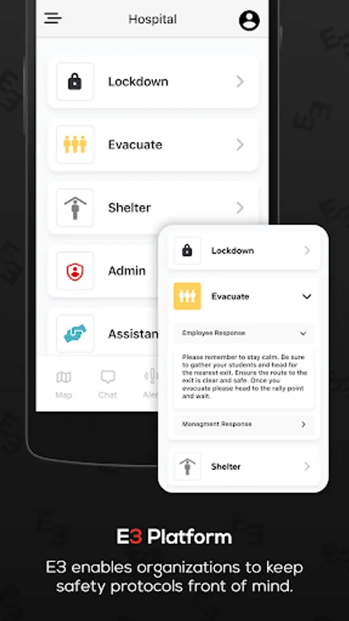 E3 allows you to manage and control any emergency at your organization. E3 connects employees, administration and first responders utilizing custom alert notifications, interactive indoor and outdoor maps, electronic emergency protocols/plans and real-time chat.