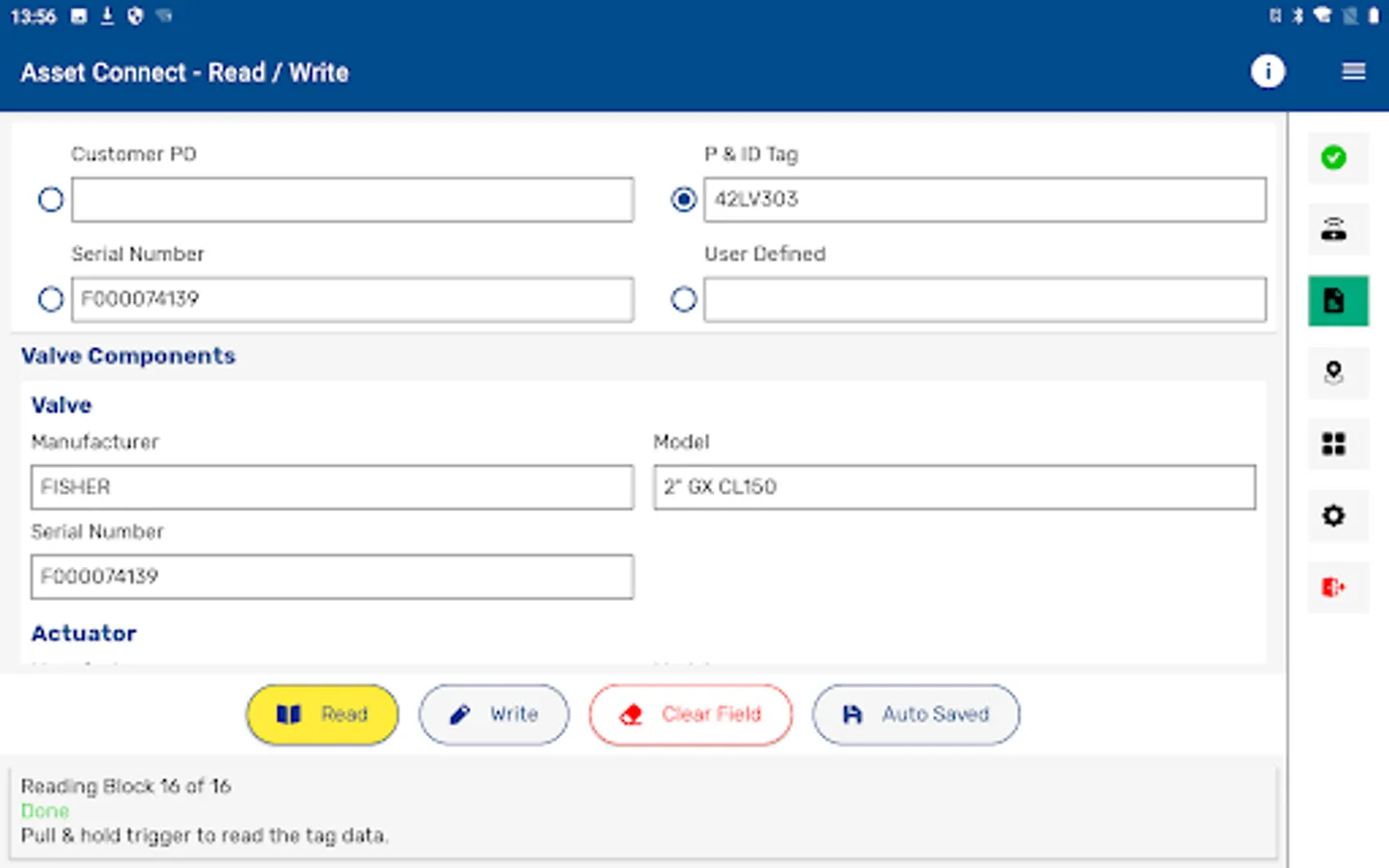 Emerson's Asset Management Tag is a vital piece of your digital transformation story. Asset Management Tags are intrinsically safe devices which use RFID technology to enable digital identification and tracking of plant equipment. Utilize Asset Management Tags to reduce the amount of time spent collecting data in the plant. Gathering complex equipment details can take up to 15 minutes per tag using traditional processes. With Asset Management Tags, this can take as little as 30 seconds per tag, plus you can retrieve information about the valve assembly from prior actions and link to other systems to reference critical information.