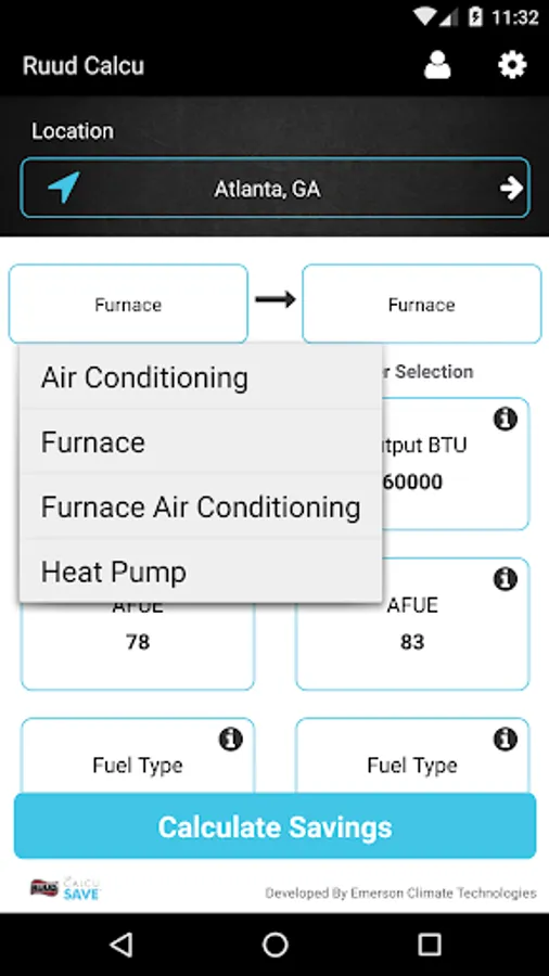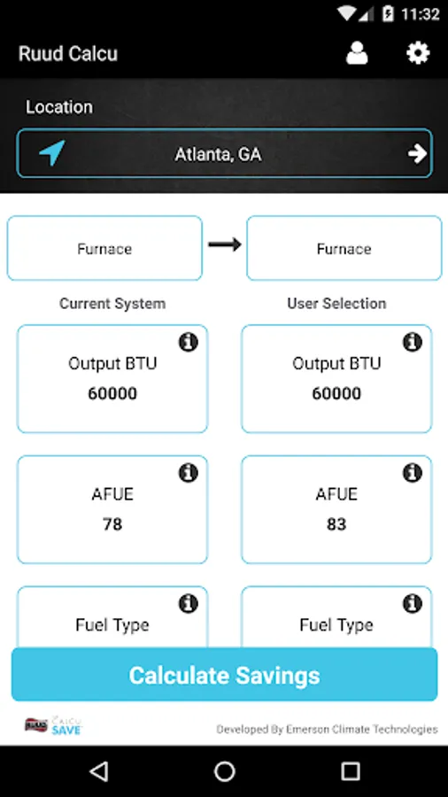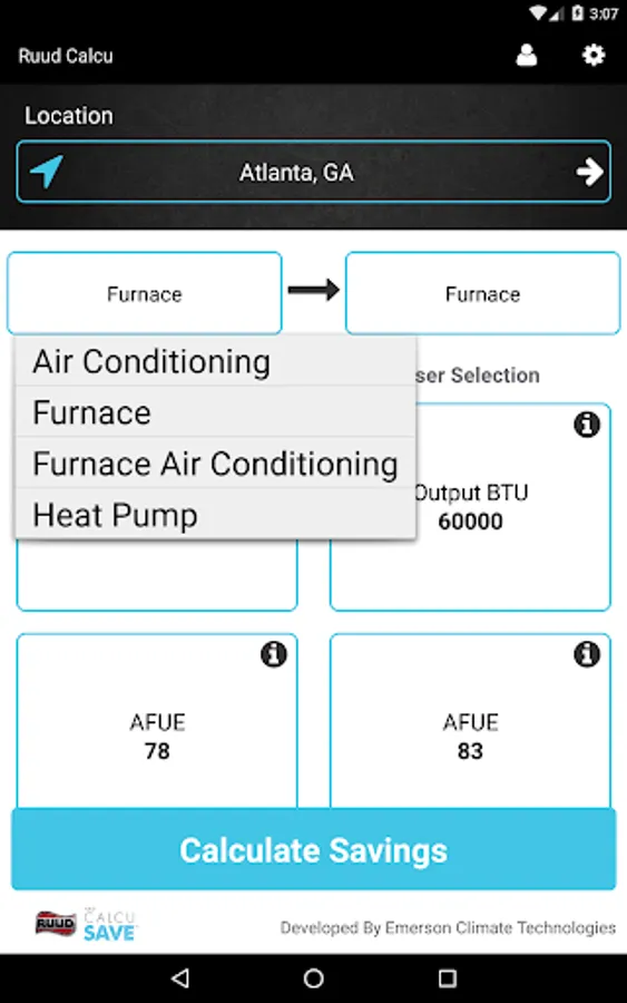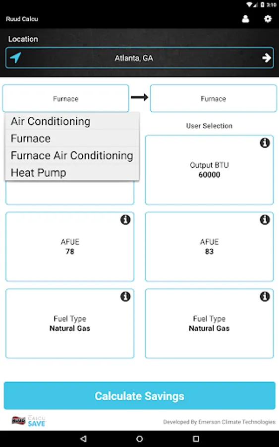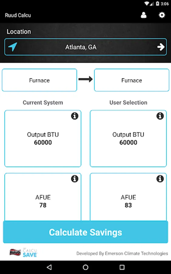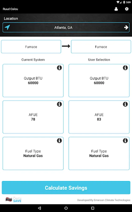 The Ruud Calcu Save app uses Emerson Climate Technologies Online Product Information (OPI) database for Ruud Heating & Cooling products to give contractors the ability to generate reliable, accurate, graphical reports.
