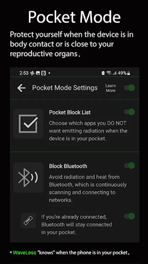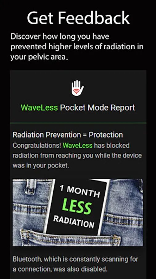 WaveLess "knows" when the phone is in your pocket and protects you when the device is in body contact or is close to your pelvic area.