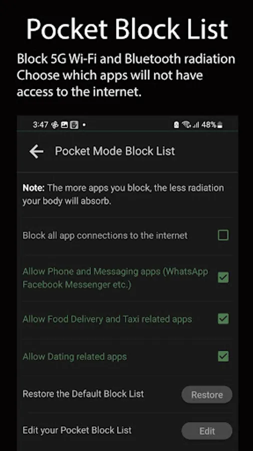 Choose which apps will not have access to 5G, 4G & Wi-Fi when a device is in pocket.