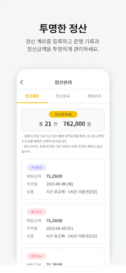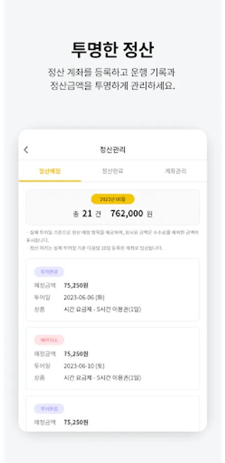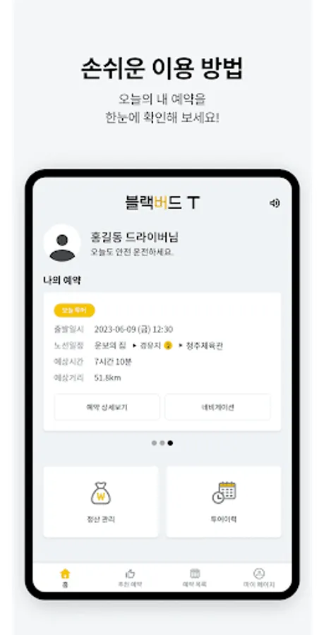 Register a settlement account and transparently manage your driving records and settlement amount. You can check the number of trips and settlement details by day/month/year.