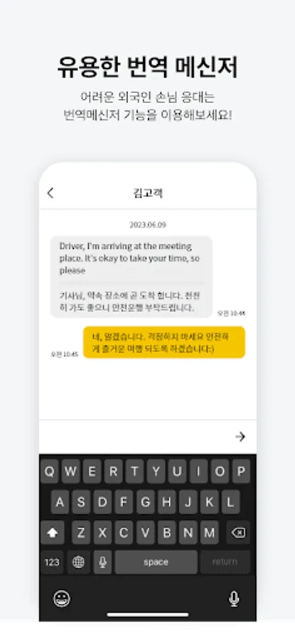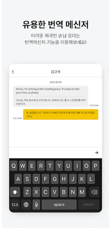 Even foreign guests, don't panic. There is no problem if you use the Blackbird T ‘Translation Messenger’ function. The message entered by the customer is automatically translated into Korean, and the Korean input by the driver is automatically translated into the customer's language and sent.
