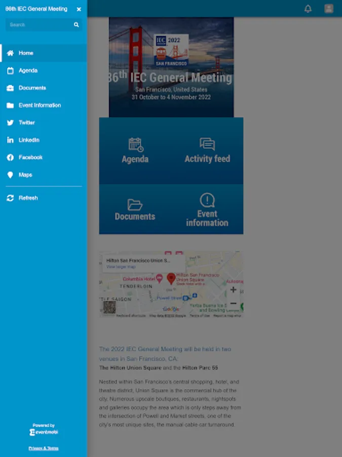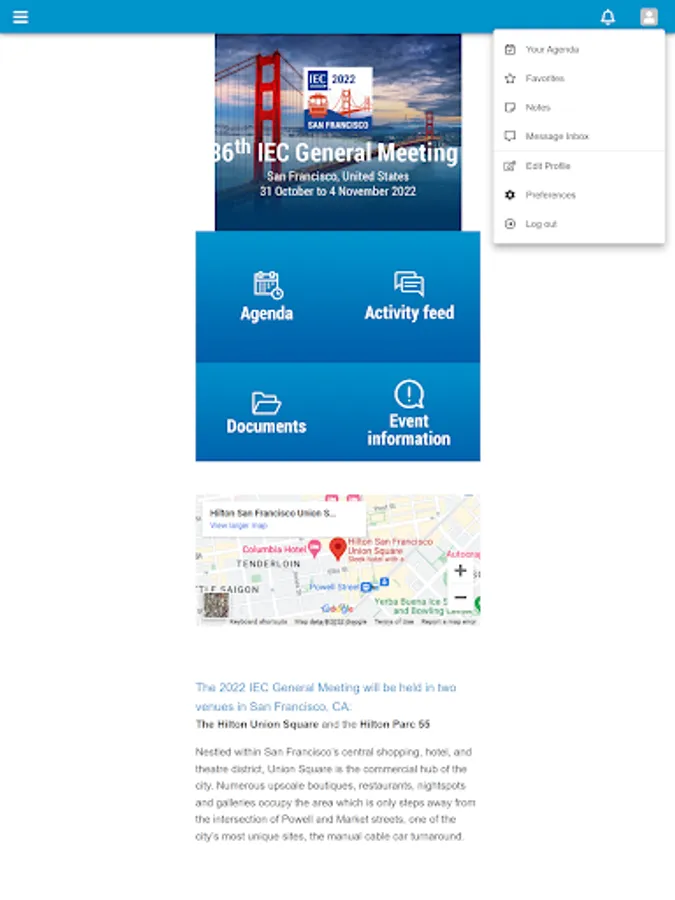 App for the 86th IEC General Meeting . The 2022 IEC General Meeting will be held in two venues in San Francisco, CA: The Hilton Union Square and the Hilton Parc 55. Nestled within San Francisco’s central shopping, hotel, and theatre district, Union Square is the commercial hub of the city. Numerous upscale boutiques, restaurants, nightspots and galleries occupy the area which is only steps away from the intersection of Powell and Market streets, one of the city’s most unique sites, the manual cable car turnaround. The two hotels are across the street from one another. Additional venue details are noted under the “Hotels” section of this website.