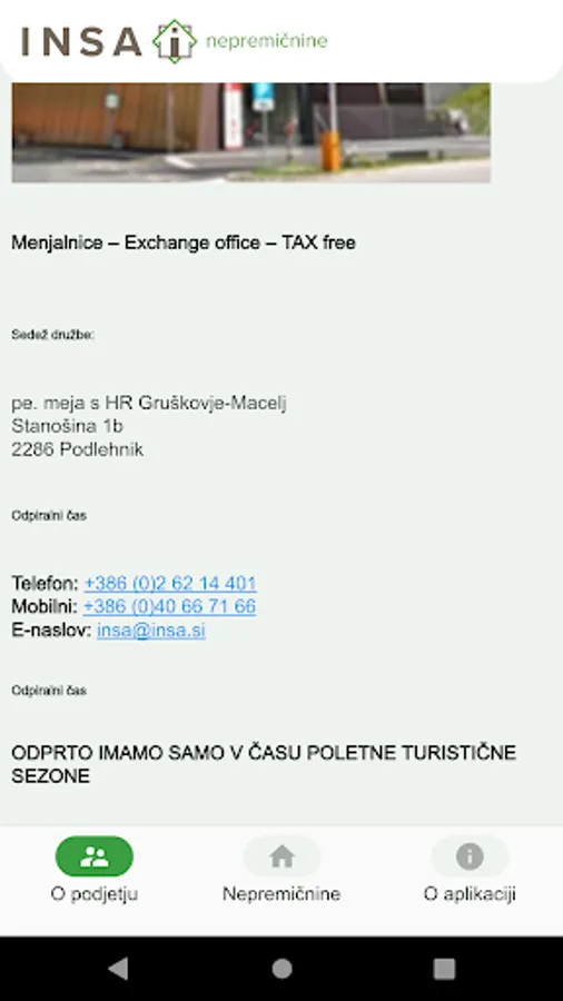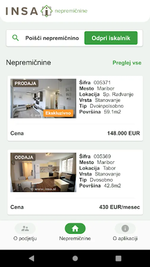Aplikacija omogoča na enostaven način pregled nepremičnin v prodaji in oddaji. Uporabnik lahko podrobno pregleda posamezno nepremičnino in preko aplikacije odda tudi povpraševanje. Uporabnikom je omogočeno tudi kontaktiranje s podjetjem preko standardiziranih kontaktnih obrazcev. Glede na zanimanje si lahko uporabnik določi iskalni niz nepremičnine in tudi potisno sporočilo, ko se v ponudbi pojavi nepremičnina s takimi značilnostmi. Uporaba aplikacije je brezplačna.
