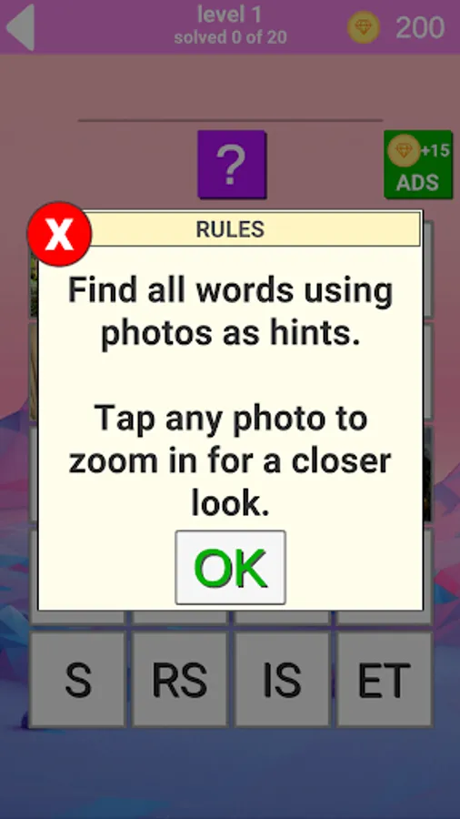 At each level, you have 20 photos available, with which you must guess 20 hidden words to complete the level. Photos are opened one at a time, and you have access to a certain number of photos.as you guess them, others will be available to you. The game is available in 7 languages: English, Russian, Spanish, Italian, Portuguese, German, and French.