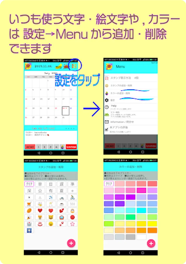 * Stamps can be added, deleted or rearranged from MENU≡ → Settings on the upper right.