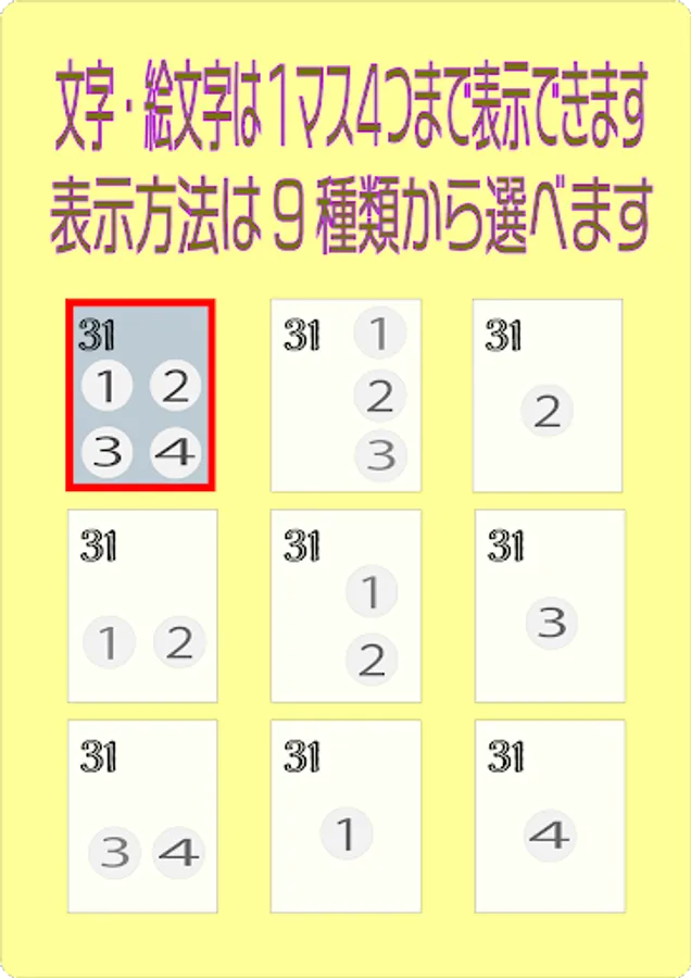 ②Emojis can be entered 4 times a day, 2 rows and 2 columns. Refer to [the number of the display button, 1, 2, 3, 4 places] on the left of the upper right menu button, select the same number as the place you want to enter from the numbers in the bottom row and tap