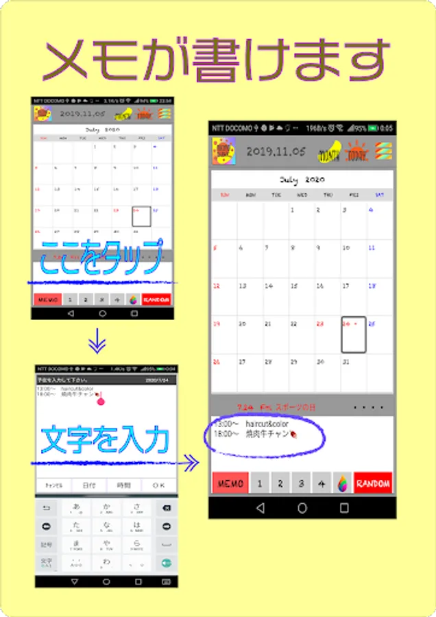 入 力 When inputting in [RANDOM] mode → Tap the pictograph / character stamp you want to insert → Tap the date you want to insert.