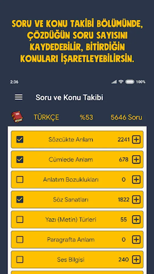 Thanks to the application, you can see all the topics that will appear on LGS in titles, and you will not lose time with the topics that you will need to study for and do not come up with. Our application is vigilant against possible system changes and is always kept up to date. You can save the topics you are working on by clicking the boxes on the left.