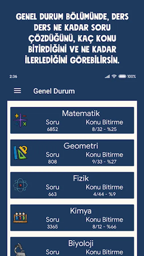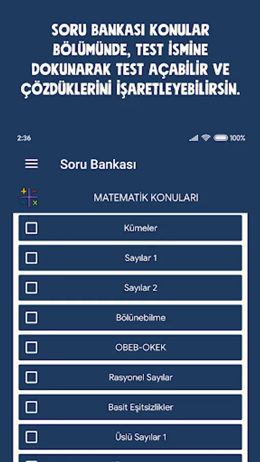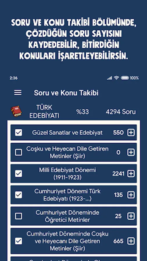 Thanks to the application, you can see all the topics in AYT as headings and you will not lose time with the topics that you need to study for the exam and the topics that will not come out. Our application is vigilant against possible system changes and is kept up to date. You can save your work by clicking the boxes on the left.