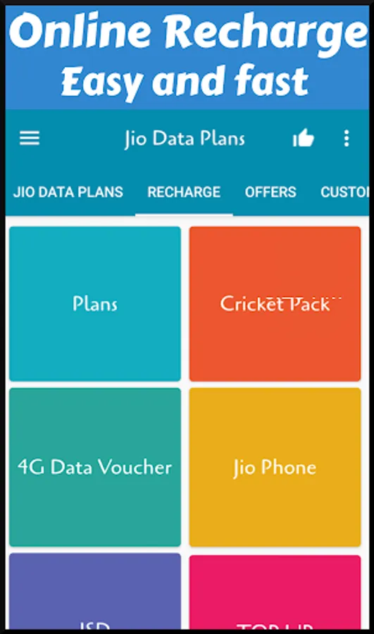 Recharge pack: App has all jio recharge packs such as Plans, Cricket pack, 4G Data voucher, Jio phone, ISD, TOP-UP