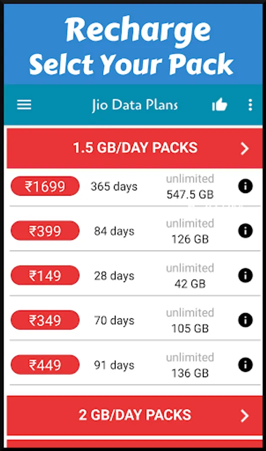my data plan: Separate tabs with all recharge pack and recharge offers listed. Select the best free data plans