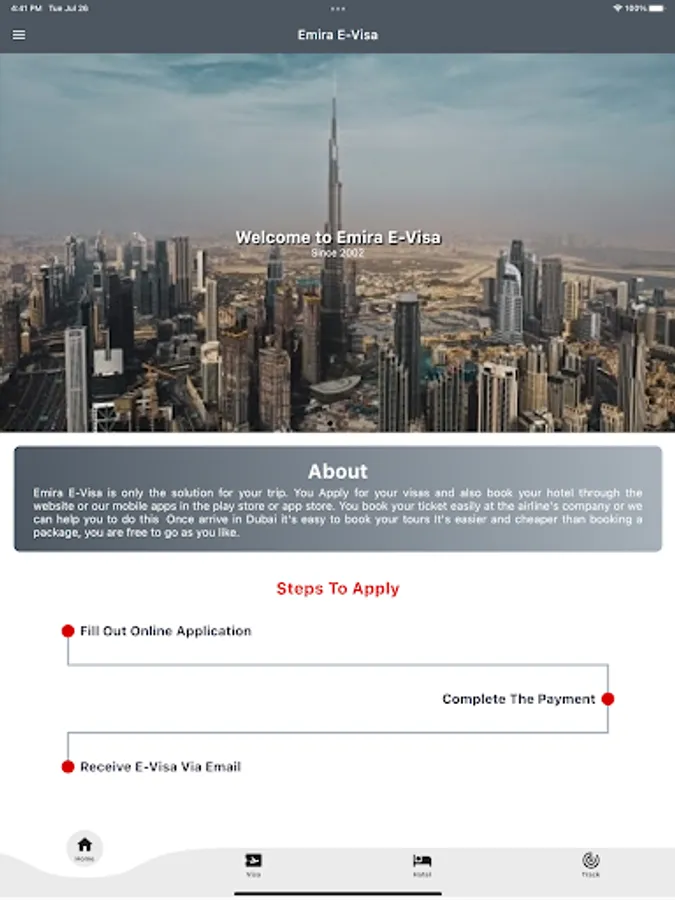 Emira E-Visa is only the solution for your trip. You Apply for your visas and also book your hotel through the website or our mobile apps in the play store or app store. You book your ticket easily at the airline's company or we can help you to do this Once arrive in Dubai it's easy to book your tours It's easier and cheaper than booking a package, you are free to go as you like.