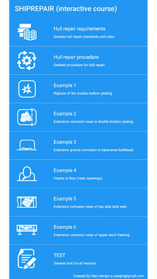 Do you know how a ship is repaired? With our interactive application, you will know all the ship hull repair requirements. Our application collects IACS and class requirements. Repair requirements, repair procedure, examples of repair of various structures and testing - it's all collected in our application.