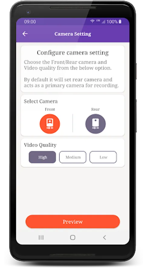 You can select the option to repeat recording daily on selected time by choosing the repeat daily option. Choose the front or Rear camera as per your need. Video Quality option among the High, Medium and Low.