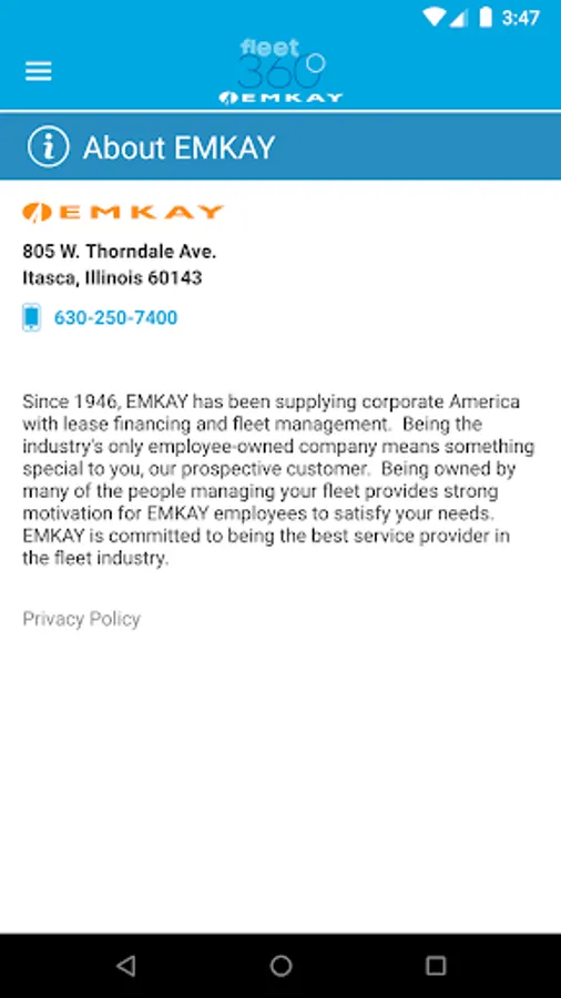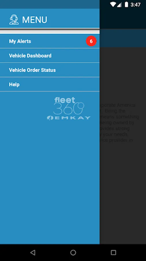 Fleet 360 provided by EMKAY, Inc. is the fleet industry’s premier fleet management Android application. Fleet 360 enables EMKAY fleet managers to perform necessary fleet functions and view valuable information regarding their fleet.